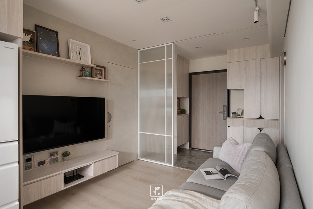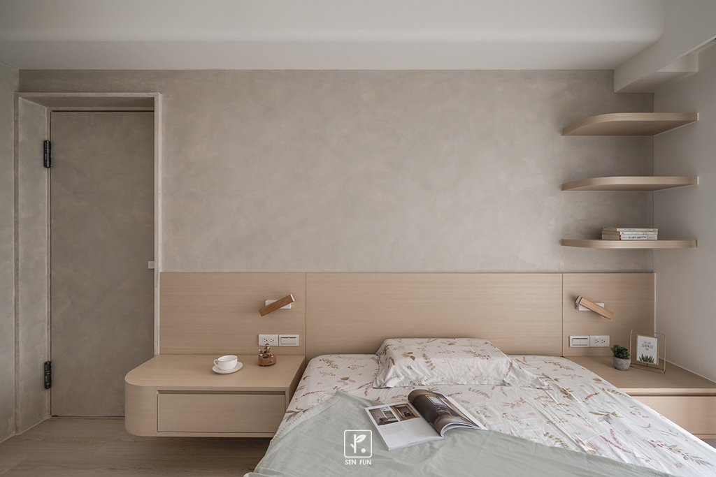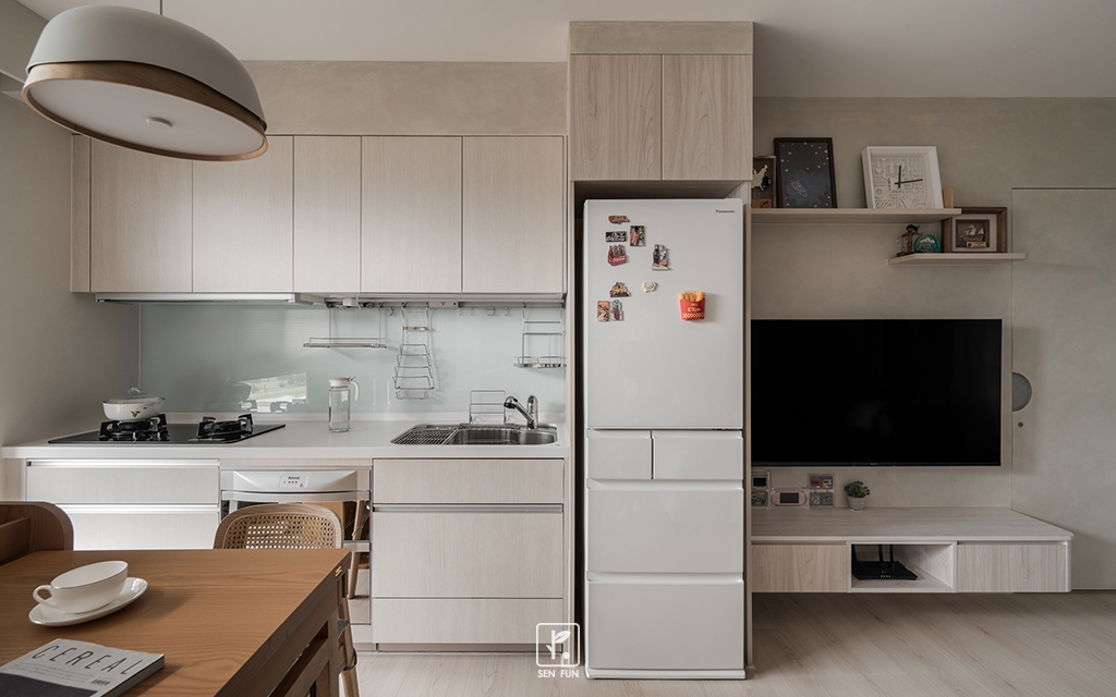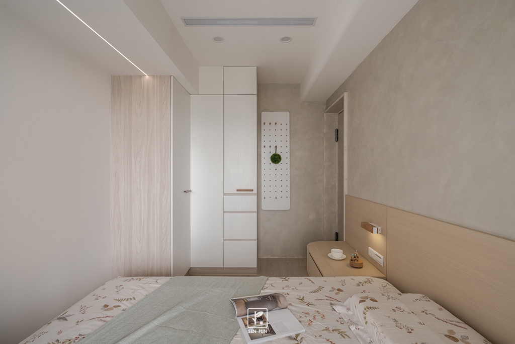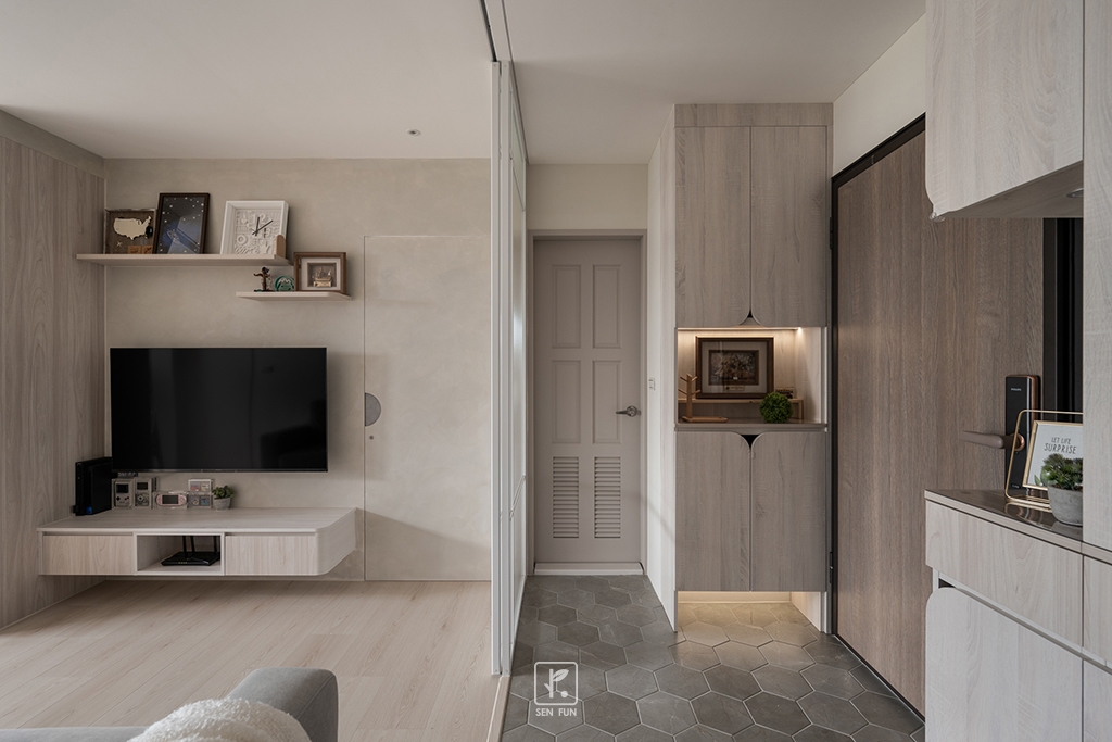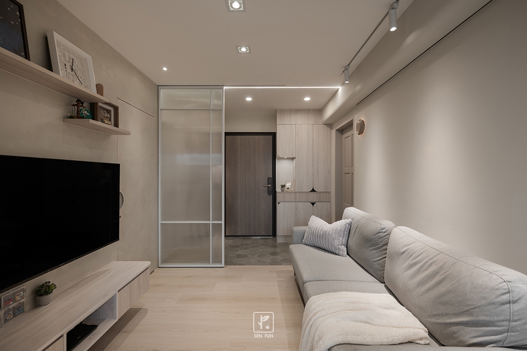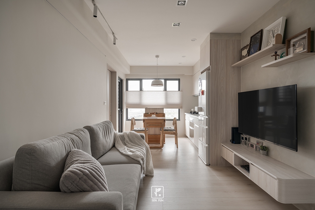 以日式侘寂為設計主軸,在有限尺度中拿捏留白與機能開放式廚房串聯餐廳與客廳,使動線流暢、視覺延伸主臥、小孩房與書房依生活需求配置收納尺度,兼顧實用與空間純淨感玄關以拉門式屏風界定內外,保留彈性與儀式感;牆面施作斯曼特塗料,呈現低調肌理,讓不完美成為日常中最耐看的風景